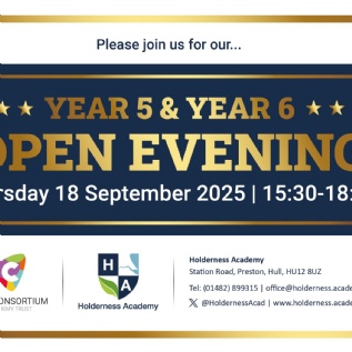 We look forward to welcoming our upcoming Holderness Learners to our Year 5 & Year 6 Open Evening on Thursday 18h September from 3.30pm - 6.15pm. Booking not required.
